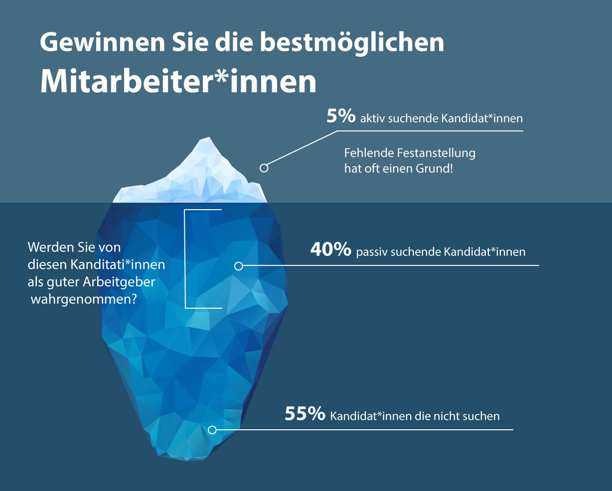 Post and Pray war gestern! Eine Stellenanzeige alleine erzeugt heute oft nicht mehr das gewünschte Ergebnis. Sie erreichen damit in der Regel auch nur die 5% der aktiv suchenden Kandidaten*innen.